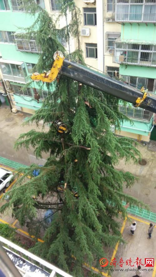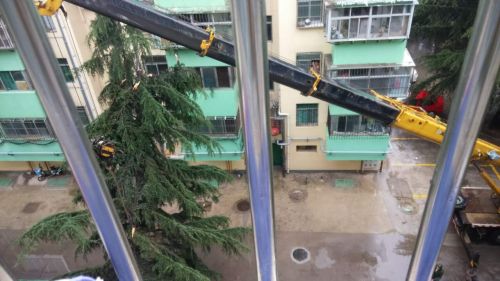 泰安十米高松树雨中倾倒,砸了居民楼