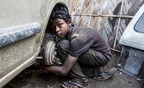 印度迪马普尔,当地一家修车厂内,13岁的童工Vikram Baruah正在工作。 视觉中国 图