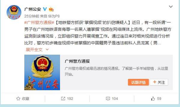 中国网7月29日讯 据广州公安认证微博今日发布的消息,近日,有一段所谓“一男子在广州地铁语言侮辱一名黑人遭掌掴”视频在网络媒体上流传。广州地铁警方监测到该情况后,立即组织警力开展调查工作。通过连日来对相关视频进行分析比对,警方初步确定视频中被掌掴的中国籍男子是违法前科人员龙某(男,27岁,贵州人,曾因扒窃先后于2012年及2014年两次被地铁警方依法处理)。今天(7月29日)凌晨1时许,民警在天河区岗顶将该嫌疑人龙某带回公安机关调查。经初步调查:龙某交代其于23日18时许,在地铁五号线区庄站至淘金站的列