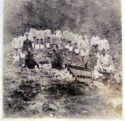 1929年秋,高孟先等少年义勇队队员在大小凉山标本采集地合影,穿黑袍坐者为彝人向导,旗上大字“标本采集团”。