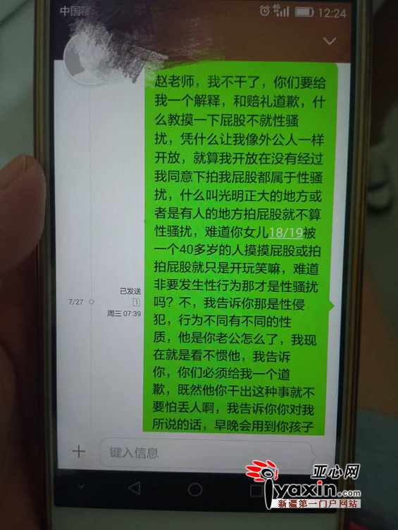 “小美也在幼儿园踢过我老公屁股,我并不觉得是骚扰。”李成刚的妻子说。7月27日一早,小美给李成刚及其妻子分别发短信,要求对方必须给她一个合理的解释,并当面赔礼道歉。在短信里,小美将在百度查询到的“性骚扰”主要表现形式发给了李成刚。