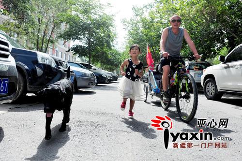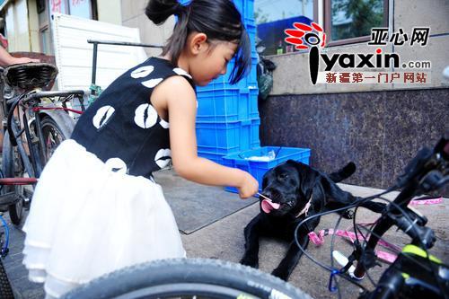 都市消费晨报、亚心网全媒体讯(文/记者 索蓉芝 图/记者 谢鹏)7月30日16时许,乌市河北西路附近,一辆自行车拉着迷你“小房车”停靠在路边,车上插着的五星红旗和一面写有“爸爸带你环中国”绿色旗子迎风飘扬。齐海亮和女儿六一蹲在狗狗“七仔”旁,给“七仔”喂水。
