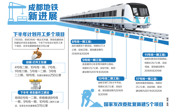 7月31日,成都地铁3号线一期正式通车。至此,地铁线网中最重要的“米字骨架”已基本成型,成都地铁线网运营里程达到108公里。此前,国家发展改革委公布已批复的《成都市城市轨道交通第三期建设规划修编(2016-2020年)》。此次规划内容全部为新规划线路,其中新建地铁线路5条,项目总投资达831.41亿元。到2020年,成都将形成13条地铁线路、总长508公里的轨道交通网络,届时全市公共交通占全方式出行量比例为33%,轨道交通占公共交通出行量比例为35%。