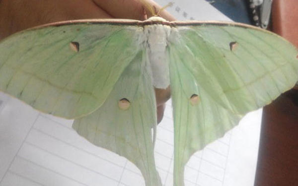 据赵先生介绍,他老家平邑武台,在市区上班多年。7月31日晚9时左右,他在老家正与同伴玩扑克时,忽然看见飞来一只大“蝴蝶”,落到了屋里,来回乱窜。“当时天有些黑,老远看像风筝一样,刚开始我以为是个蝙蝠,后来出于好奇抓到了,感觉又像只蝴蝶。”赵先生说,捕到的这只“蝴蝶”色彩艳丽,以嫩绿色为主,经卷尺测量,展翅超过16厘米,“看起来挺漂亮的,出于好奇我就带回来了,但询问了好多人,大家都不认识。我们都好奇,这是什么昆虫?”