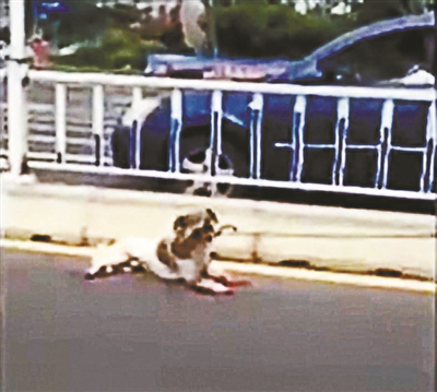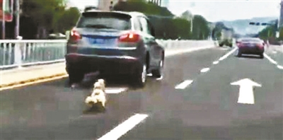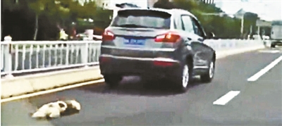 视频内容显示,一辆打着双闪的银灰色越野车在内车道低速行驶,车后一只被绳子拴住脖子的黄白相间的犬只在奋力跟跑。数秒后,因为赶不上车速,犬只摔倒在地,随后被越野车拖行数米远。从视频中可以看到,当拖狗车辆被拍摄视频的车主别停之后,犬只趴在地上吐舌喘息,犬只四肢及身后留有清晰血迹。