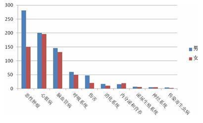 男性、女性的前十位疾病相同,但顺位不同,女性心脏病、内分泌营养代谢疾病所造成死亡的顺位高于男性;而恶性肿瘤、消化系统疾病的位次要低于男性。前十位死因中,除内分泌营养代谢疾病外,其他各种疾病的性别死亡率男性均高于女性。