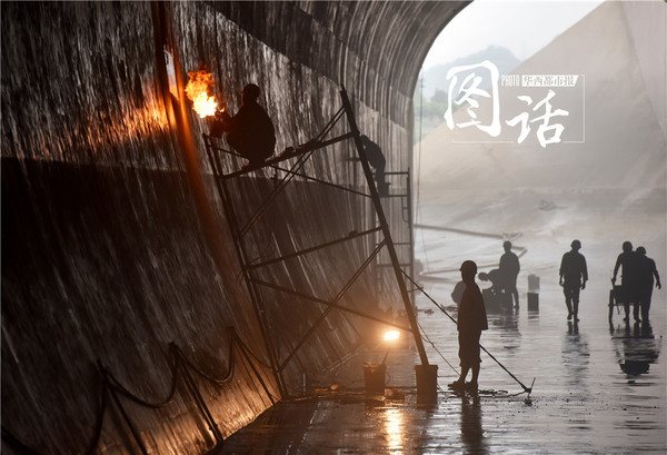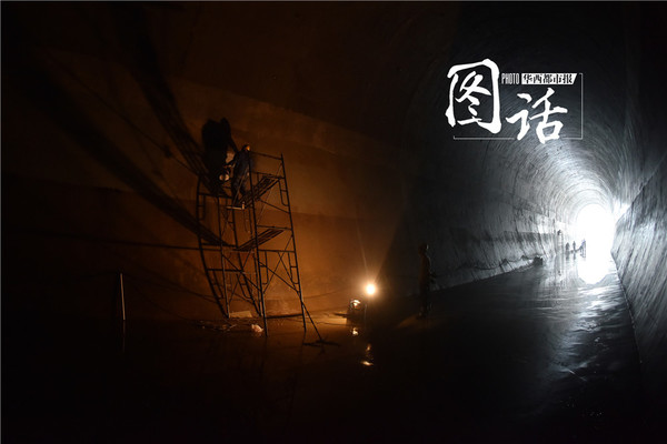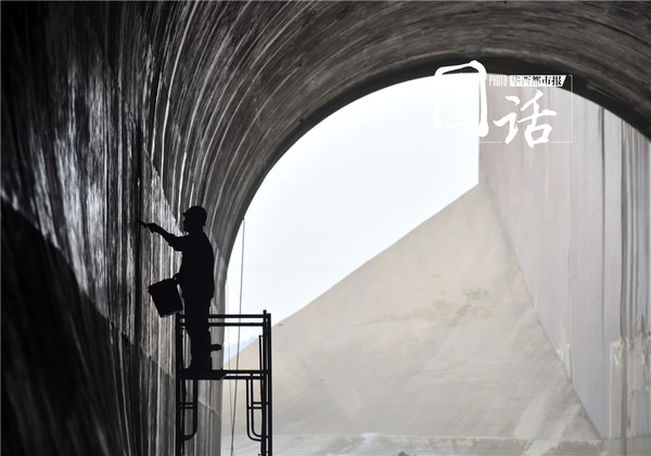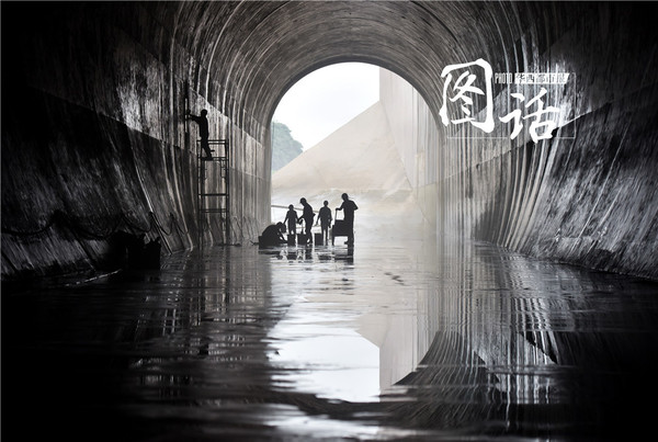 【工人们维修泄洪洞内破损的洞壁。洞口一孔亮光透了进来,洞顶,在亮光的照射之下呈现出亮灰色的半环,一环紧扣一环,密密匝匝,层层叠叠,遥望,深邃犹如时空隧道。】