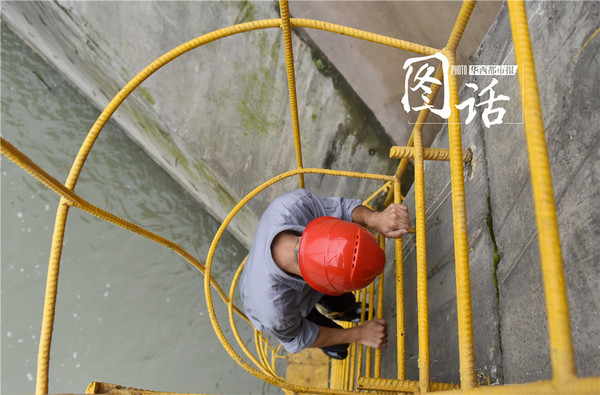 记者一行签署了安全责任书、戴上安全帽,带上超大手电筒、穿上及膝的水靴,顺着山体搭建的黄色钢梯,下行128级台阶,再下行一段14级、垂直于滔滔江水的钢梯,侧身登上转角约45度的钢梯,费力爬上反弧挑坎,终于来到了这个泄洪洞的尾部。