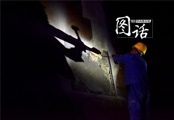 在泄洪洞一侧,两名工人师傅撑住一个钢架子,架子上方,工人刘坤站在那里,伸展着手臂,用机器先切割出了一个四四方方、约摸0.4平方米的形状,再用锤子敲打着,墙壁上的一层壳飞溅落地。