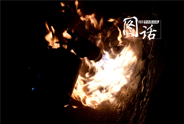 “鸣!”他启动了角磨机,把敲打后裸露的基面打磨平整。一时间,他的上方腾起一股尘雾。打磨好后,架子下的工人点燃汽油喷灯,待到那团橙色火焰吐出蓝色光束时,将灯递给刘坤,他再对准打磨后的地方烘烤。