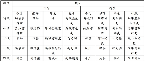 第三,工艺的优化,起初我采用大叶子进行加工后来尝试采用小叶子,经过6年试验与生产实践,极白氨基酸红茶在工艺、口感上都很稳定,我曾专门带着安吉红茶两次去祁门红茶研究所找专家老师评审,专家认为我们的红茶色、香、味都很好不逊于祁门红茶,但揉捻、发酵不足,回来后经过进一步的揉捻、发酵研究。现在极白红茶形成了稳定的工艺,工艺流程:萎凋——揉捻——发酵——干燥——风选——精选,同时,我们参照中小叶种功夫红茶国标将极白红茶进行了分级,如下5级。