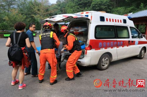 原标题:泰山一游客突发胃炎 消防官兵紧急救援