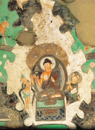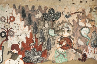 画师为何要在窟内表现菱形山峦,或者说,为什么要满窟表现一片山林环境?这要从一个故事说起。据《长阿含经》记载,当释迦牟尼在毗陀山因陀娑罗窟中入火焰三昧之时,忉利天主帝释天欲拜访佛陀,于是先令乐神般遮翼来到佛窟旁边,弹奏琉璃琴,娱乐佛陀。之后,帝释天率领群神至佛所,向佛提问。这一故事在印度流传很广,唐代的玄奘在印度游学时还看到了“帝释石室”的遗址。在古代犍陀罗雕刻中,“帝释窟说法”也是被广泛表现的题材——冥想的佛陀端坐于山岩窟穴之内,四周雕刻岩石、动物、天人……