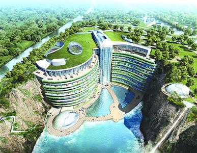据介绍,在整体规划上,酒店将主体建筑放在采石坑的东面崖壁位置,沿崖壁竖向布置主体客房和餐饮娱乐设施。与主体建筑相联的群房限高10米,尽可能在水平方向展开,使建筑各个功能部分既可相通,又保有各自单独的出入口,确保安全。