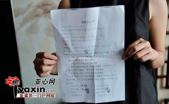 8月16日,乌市迎宾路路锦家园小区,王悦(化名)拿出当天发生肢体冲突后,经执法人员调解后双方达成的协议书复印件。亚心网记者 喻义昌 摄