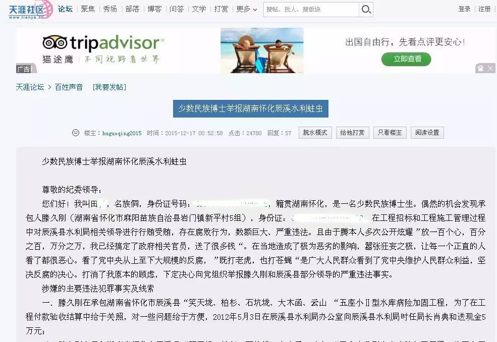 2015年12月,湖南某高校博士生田先生在网上实名发帖,举报怀化市辰溪县的一项水利工程在招标过程中存在腐败行为,其持有的一个账本显示,该工程的包工头给水利局领导行贿数万元,涉及水利局局长和副局长等人。
