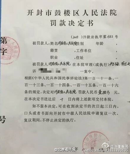 河南:法院以遭无端刁难为由向医院开10万罚单