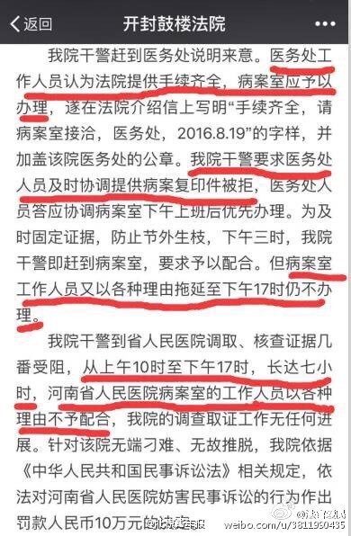 “从上午10时至下午17时长达七个小时,河南省人民医院病案室的工作人员以各种理由不予配合,法院的调查取证工作无任何进展。”开封市鼓楼区法院称,“针对该院无端刁难、无故推脱,我院依据《中华人民共和国民事诉讼法》相关规定,依法对河南省人民医院妨害民事诉讼的行为作出罚款人民币10万元的决定。”
