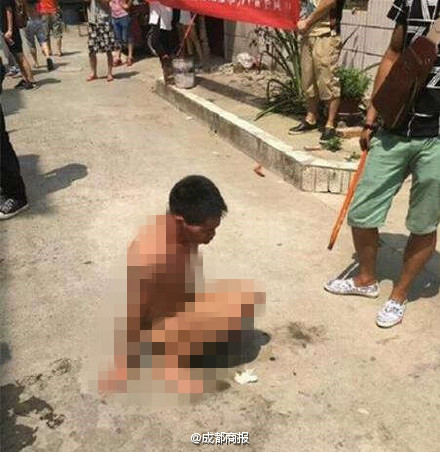 新京报此前报道,8月20日下午,一段视频在网络流传。视频中,一名男子瘫坐地上,一丝不挂。在他两旁,一名男子用棍子抵住其下颌,另一男子一把揪住其头发。四周,多人举着横幅,谴责裸身男子。新京报记者获悉,事发四川成都龙泉驿区十陵镇,事因裸身男子拍摄虐狗视频,并网络传播牟利。当地动物保护志愿者,将其“抓获”并游街示众。
