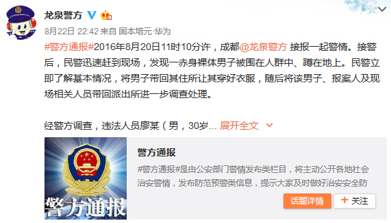 成都龙泉驿警方此前通报,裸身男子姓廖,贵州人,今年30岁。事发当天,该名男子因为涉嫌传播淫秽信息,被警方处以行政拘留并处罚款。