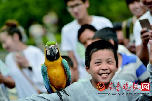 如此近距离地接触美丽的鹦鹉,来自枣庄后枣村的李秋运既紧张又兴奋。 本报记者 陈文进 摄