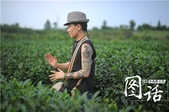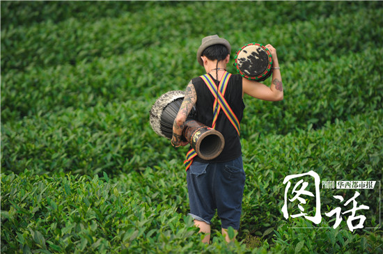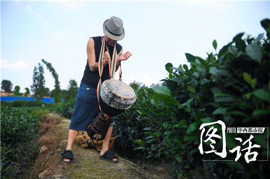 牛铃叮当,鼓点阵阵。8月16日,成都蒲江县的一片茶园里,曼丁鼓队队长马慧敲击着鼓面,其余队员则踩着节拍敲击敦敦鼓。