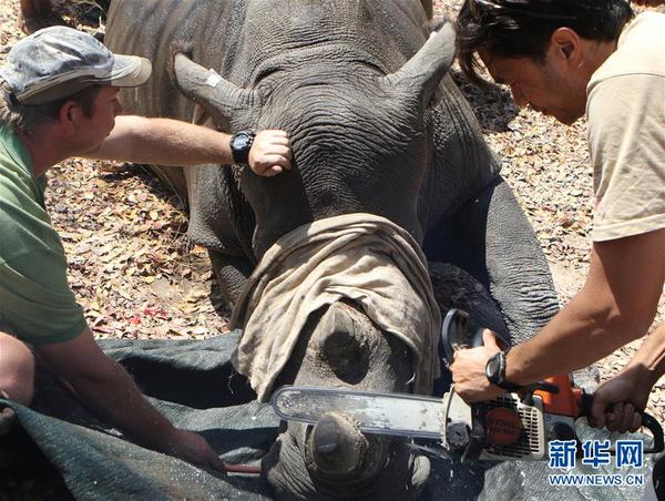 8月25日,在津巴布韦诺顿的奇弗罗游乐园,动物保护组织的成员为一头白犀牛锯角。动物保护组织通过为犀牛锯角的方式来保护犀牛不被偷猎者杀害。新华社/路透