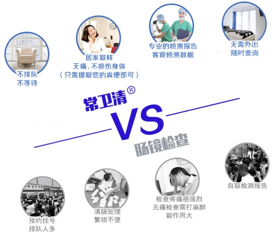 与传统肠镜检查方法相比较,常卫清® 具有无痛、无创、非侵入的特点,而且整个过程可以居家实现,无需排队,挂号,以及服用泻药清肠,手术麻醉等等。对于绝大多数人而言,方便、简洁、高效、专业的常卫清®立等可取,终于可以跟“肠镜”说拜拜了。