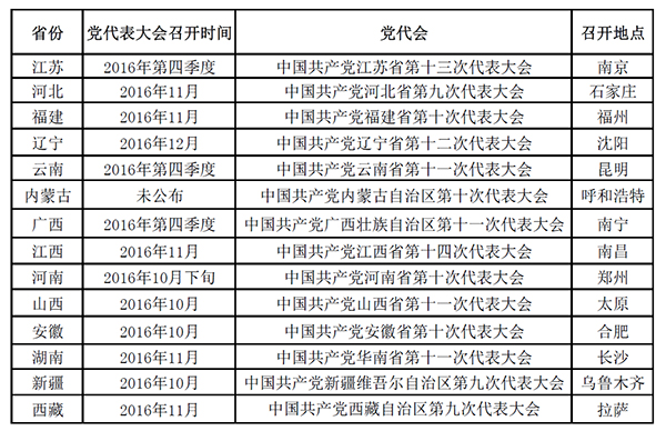 截至2016年8月31日,上述14个省份的党委全会均已决定将召开下一次党代表大会。除内蒙古外,其他13个省级党委全会已明确将下一次党代表大会的召开时间确定在今年第四季度。