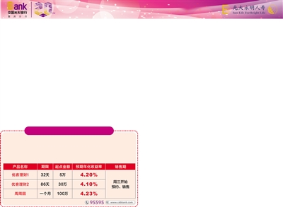 炎炎夏日,让光大银行为您的财富再添把火吧!7月起,光大银行开启了盛夏风暴理财季活动,雷打不动的“红色星期三”为广大投资者提供多款理财产品,起点亲民、期限灵活,光大银行各网点均可咨询购买。
