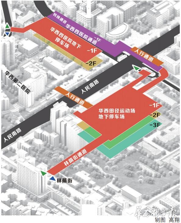 此外,从南门世纪城、高新方向的来车,经人民南路三段右转进入林荫街、再左转就可以进入地下停车场。停车后,市民可通过停车场四角的直梯直达地面,也可通过负二层的人民南路下穿通道步行直达路对面的华西二院、华西四院。