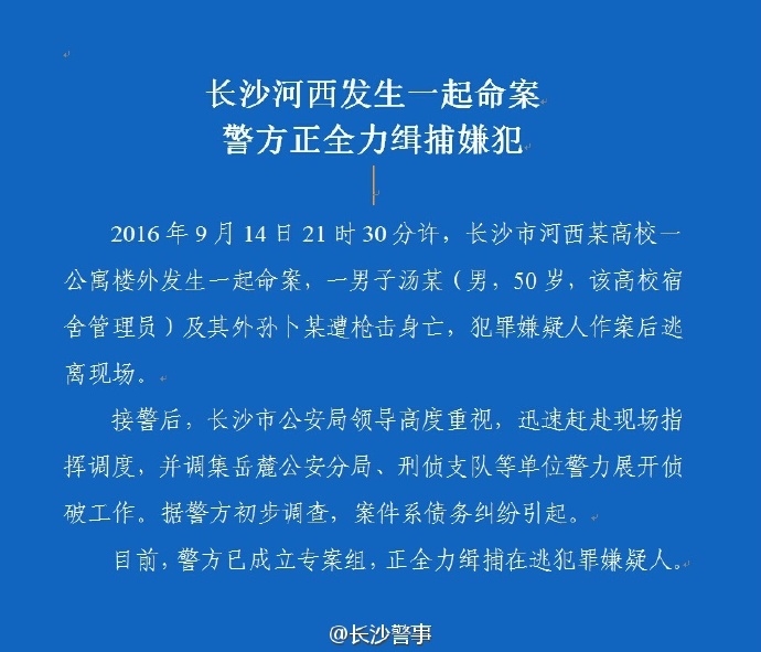原标题:长沙河西发生一起命案 警方正全力缉捕嫌犯