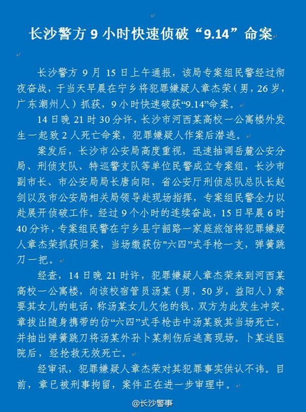 原标题:长沙警方侦破"9.14"命案 嫌疑人被抓获