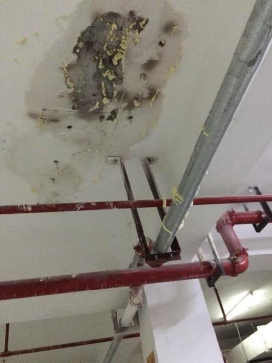 段先生家同样在5号楼。“我家是7月底开始装修的,8月份开始发现房顶开始爆裂。”段先生说,现在他家房顶上大概有五六十个爆裂点,爆裂处混凝土中夹杂着红黑色的粉末。