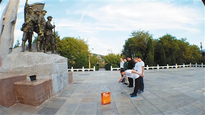 夕阳西下,商州区红军广场上,本报采访团成员和商州区委宣传部、党史办及金凤山红军广场管理处负责人用6年西凤酒为牺牲的红军先烈祭奠并鞠躬默哀。