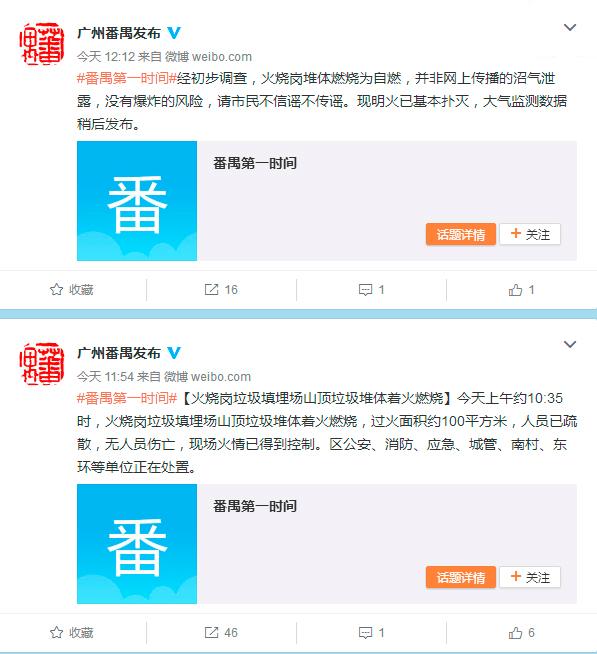 9月27日上午11时许,广州市番禺区政府新闻办公室官方微博 @广州番禺发布 发布消息称,今天(9月27日)上午约10时35分,火烧岗垃圾填埋场山顶垃圾堆体着火燃烧。