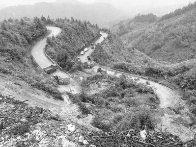 德化县水口镇通往梨坑村(湖石线)溪兜村路段大面积塌方、溜方,泉州市公路局于28日5时许组织附近待命的雷锋、南埕公路站抢险人员及抢险机械到现场支援、抢修受灾路段。 通讯员 尤惠艺 摄