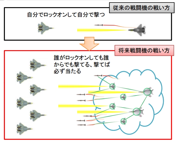 与美军对四代机的4S要求不同,按空自设想,日本未来战机的标准是“3F能力”:首先发现、首先攻击、首先摧毁。《军事研究》月刊解读称,其的核心概念是信息化和智能化,包括:战斗机群以“云射击”的方式共享信息,作为一个整体去投入战斗;战斗机可以接收上层平台(预警机、预警雷达等)的信息,也可以对下层平台(无人机)进行控制,实现“群控制”。