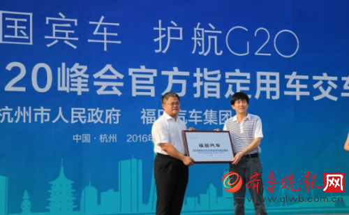2016年8月16日,杭州萧山,国内最大的商用车集团福田汽车正式将180辆绿色国宾车交付G20峰会组委会,其中80辆福田欧辉新能源客车——智蓝BJ6127插电式混合动力城间客车,主要承担G20峰会各国政要、全球官方媒体等团体会议期间的交通摆渡工作。