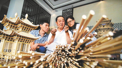 “所有扎刻作品的骨架都是由六根高粱秆锁扣而成,将锁好的秆从下往上、从里往外,一层层做起来,就像盖房子。”徐艳丰介绍,“扎刻的关键是尺寸要掌握好。每根秆的直径都用游标卡尺一一校对,误差不能超过0.3毫米。高粱秆不可能个个笔直,你看现在的梁柱都是笔直的,那是因为在扎刻之前,用酒精灯一一烤直的。秆直且一样粗,扎刻出的作品才会整齐。而且这样装上的每扇门和窗才能够打得开、关得上。”