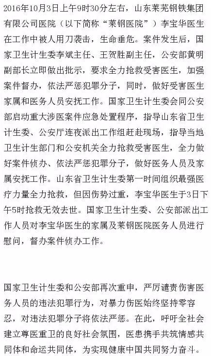 10月4日下午,莱钢医院所属的山东省银山公安局发布案情通报,将该案定义为一起“严重伤医事件”。目前警方已成立专案组侦办此案,嫌疑人也已被刑事拘留。