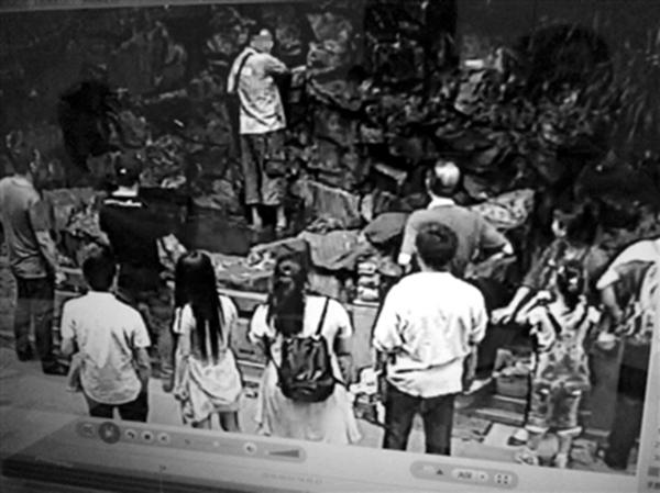 监控显示,这名男子不停地从许愿池内捞硬币,塞进自己拿着的塑料袋里。