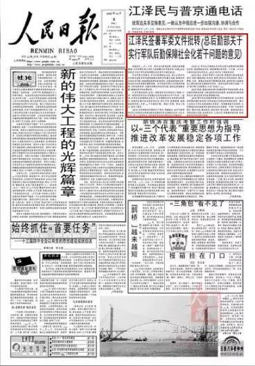 2002年10月7日江泽民签署军委文件批转《总后勤部关于实行军队后勤保障社会化若干问题的意见》