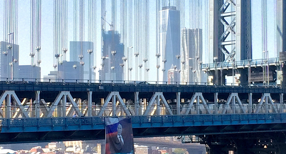 原标题:普京64岁生日 纽约曼哈顿大桥惊现神秘贺寿海报