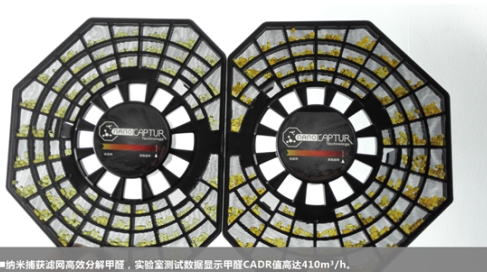 且随着分解的甲醛增多,纳米捕获滤网附有的纳米颗粒会从淡黄色逐渐变成深棕色,去甲醛的效果清晰可见。