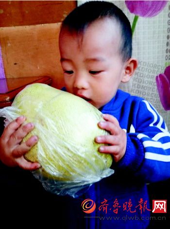 两岁的陈宇洋抱着梨就像抱着一个小西瓜。