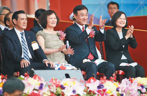 2016年“双十大会”昨天在蔡英文办公室前举行,前台湾地区领导人马英九(左一)受邀出席,节目表演时,蔡英文(右一)笑得相当开心,马英九则大都表情严肃。记者胡经周/摄影 图片来源:台湾《联合报》