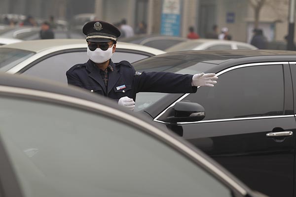 河北省石家庄市,在一停车场指挥交通的保安戴着口罩。 视觉中国 资料
