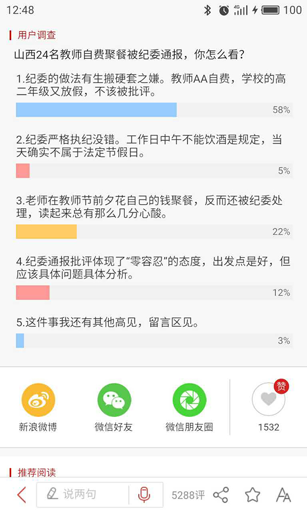 有22%的用户选择了“老师在教师节前夕花自己的钱聚餐,反而还被纪委处理,读起来总有那么几分心酸”。