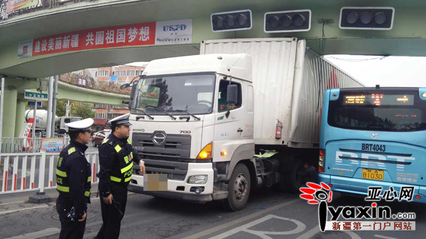 4.5米“超高”货车走BRT车道被卡天桥下